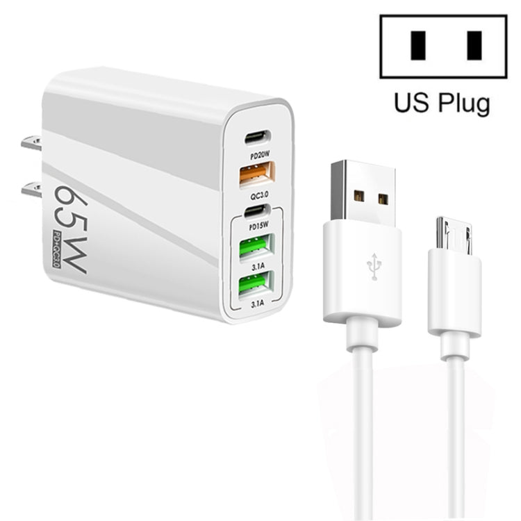 65W Dual PD Type-C + 3 x USB Multi Port Charger with 3A USB to Micro USB Data Cable, US Plug(White)