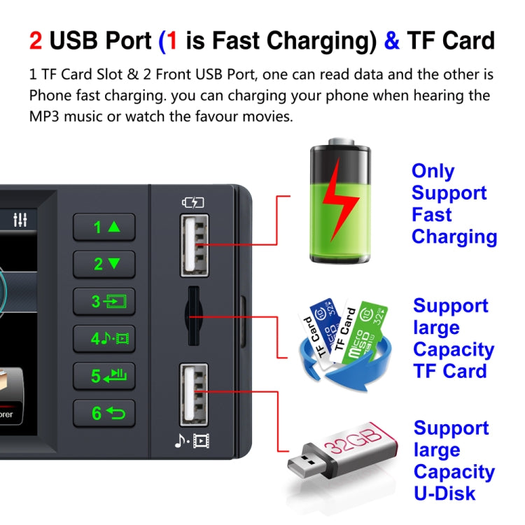 23. Two USB port(one play music, one support for phone fast charge)