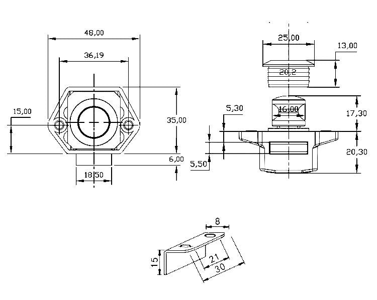 5. Size: 52.5 x 48 x 21mm; Hole diameter: 20mm; suitable thickness: 15-25mm